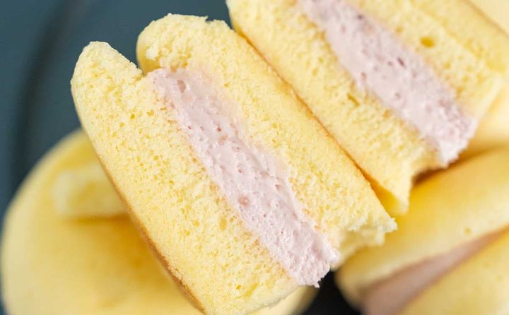 ふわふわ食感のとても柔らかいスフレ生地はほんのり甘くて、それだけでもおいしいと思える仕上がりです。そこに、ほどよいコクのある苺レアチーズクリームが加わることで、ほどよくフルーティーな味わいに。苺風味のレアチーズクリームは、すっきりとした甘さで心地よい食べ心地です。