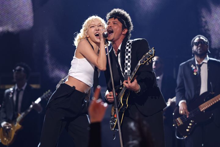 ロゼとブルーノは、大ヒット曲「APT.」をエネルギッシュに演奏し、この夜の雰囲気を決定づけた。ロゼは内なるパンク魂を解き放ち、モッシュする大勢の観客を従えてステージ上を踊り回った。ブルーノはギターを弾きながら、ロゼと一緒に熱唱。当然のことながら、このパフォーマンスはまさに壮大なグラミー賞授賞式の雰囲気を作り上げた。