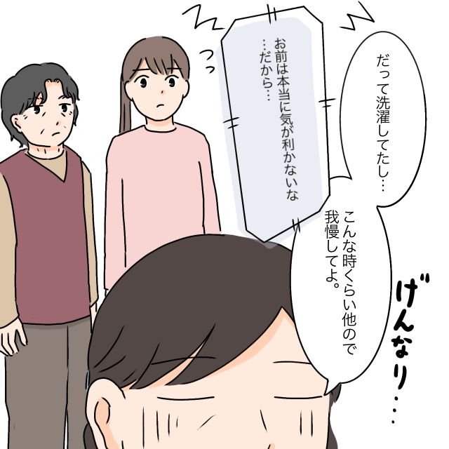 「だって洗濯してたし・・こんな時くらい他ので我慢してよ」げんなりしながらそう言うと、「お前は本当に気が利かないな・・だから・・」と文句の止まらない義父。そんな義母と義父のやりとりを見ていた義祖母と私。