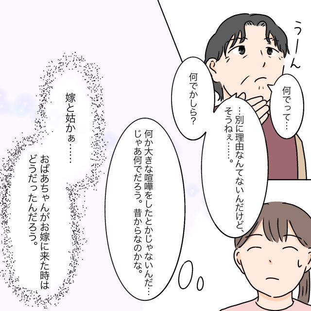 義祖母は「うーん」と考え込みながら、「・・別に理由なんてないんだけど、そうねぇ・・何でかしら?」と意味のない不毛なやりとりをしていたことが露呈。「何か大きな喧嘩をしたとかじゃないんだ・・じゃあ何でだろう。昔からなのかな」と考え込む私は、「嫁と姑かぁ・・おばあちゃんがお嫁に来た時はどうだったんだろう」と思い、