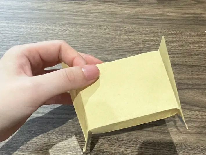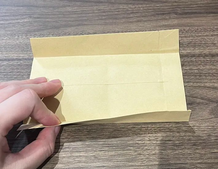 茶封筒の中に手を入れて広げたら、底を広げながら三角形の出っ張りを作ります。
