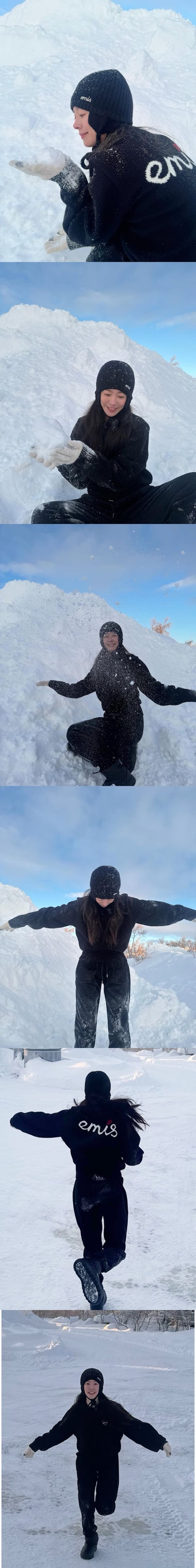 公開された写真には、一面銀世界となった雪原の中で、無邪気に雪遊びを楽しむハン・ジミンの姿が収められている。降り積もった真っ白な雪に負けないほどの透明感あふれる肌と、楽しげな笑顔が印象的だ。
