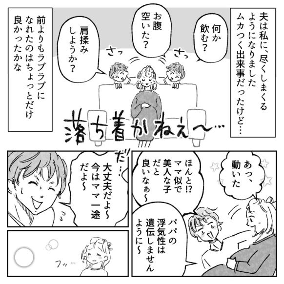 現在妊娠中のカホ。生まれてくる子どものことを考えて、毎日幸せに過ごしていたが、最近は夫の行動が怪しいことが気になっていた。やたらと帰りが遅い日が増えたり、見た目に気を遣ったりと、以前はしなかった行動が目立つようになっていた。しかし、隠れて夫のスマホをチェックしても、決定的な証拠は出てこない。そんなある日、女友達との何気ない会話で、夫が社用携帯を持っていたことを思い出すカホ。早速夫が寝ている間に隠れて社用携帯をチェックすると、なんと想像もしないやりとりが残っていた!?