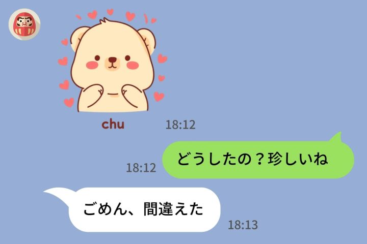 3. いつも塩対応の彼から突然「ちゅっ♡」と甘いスタンプが→「間違えた」と慌てる彼に違和感