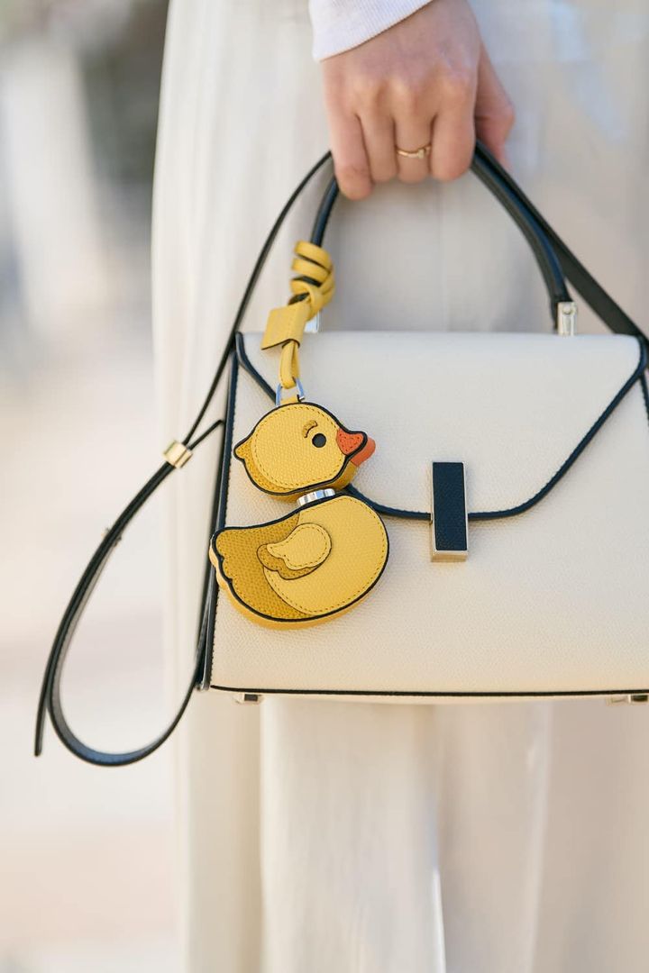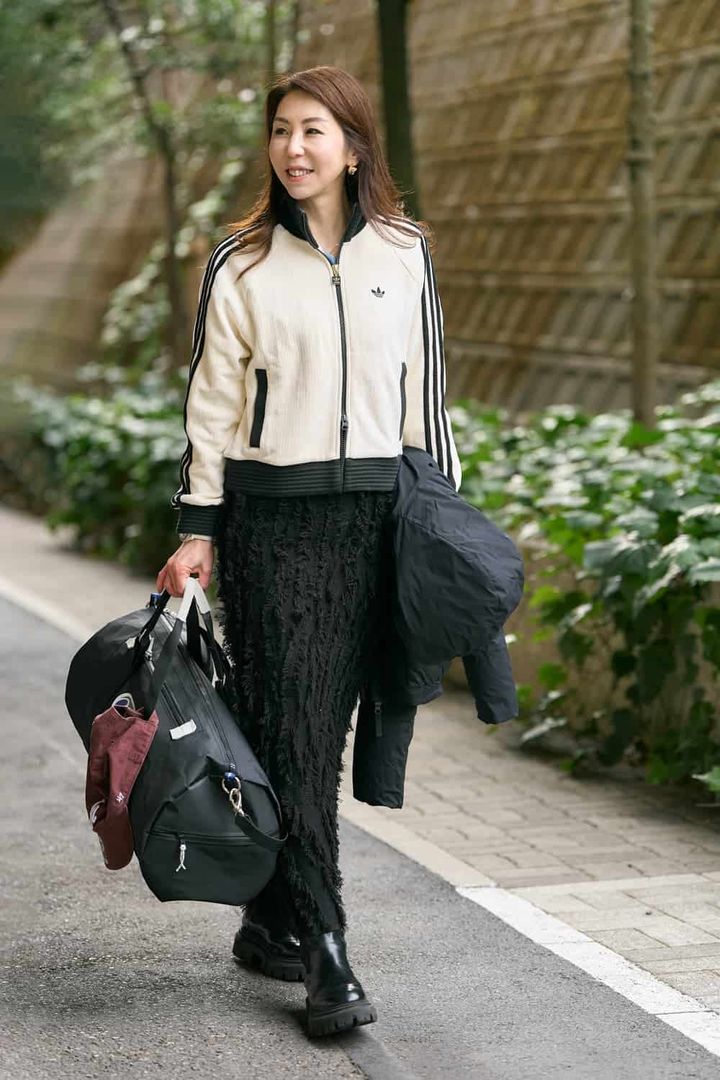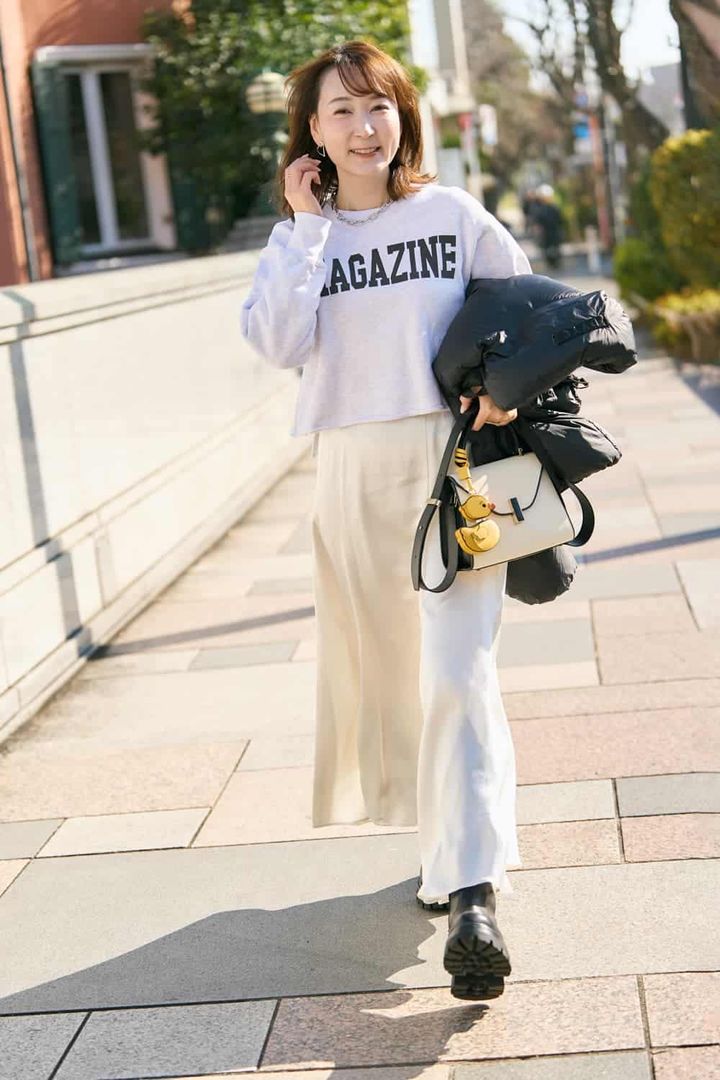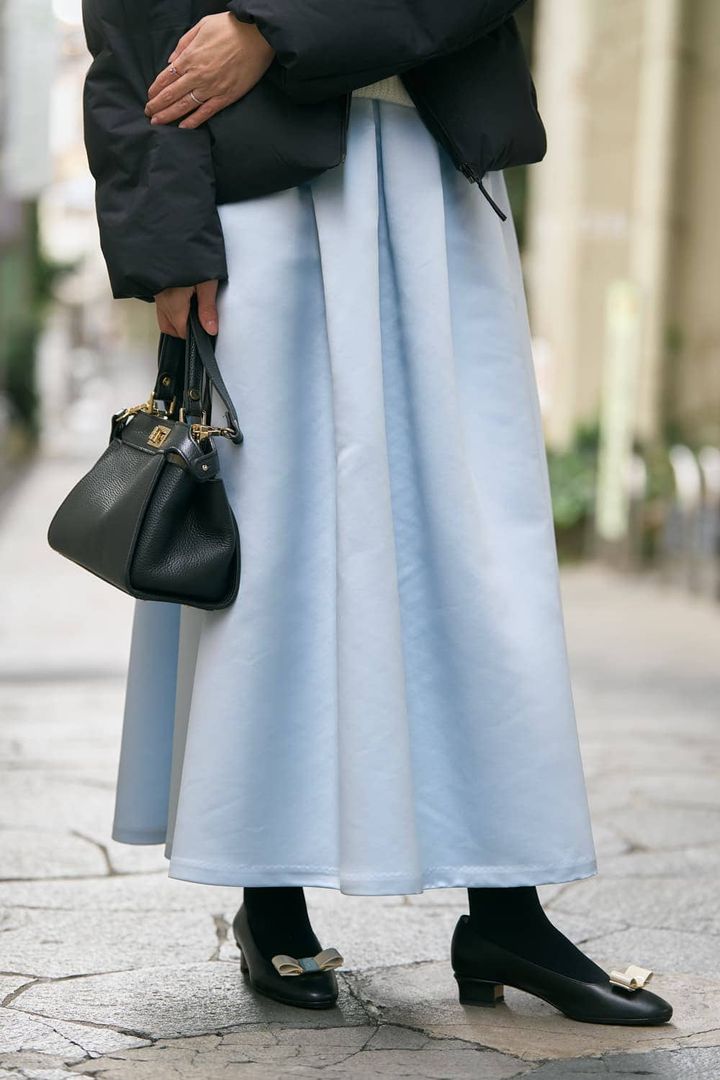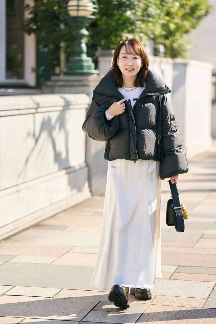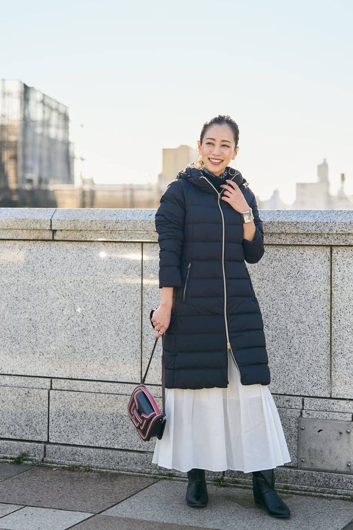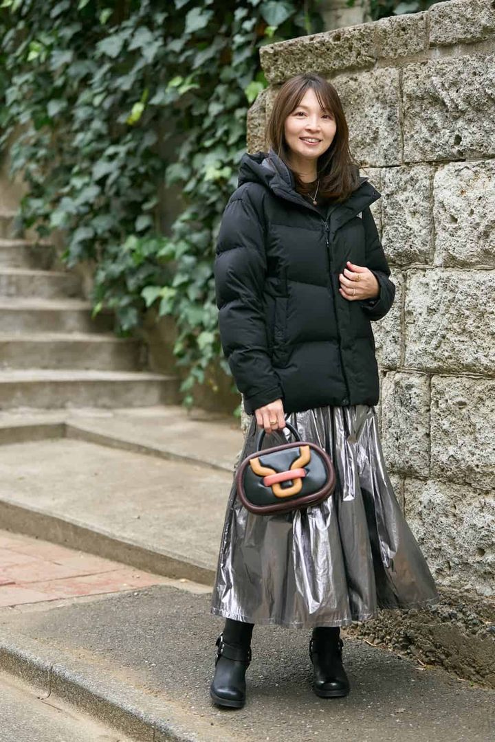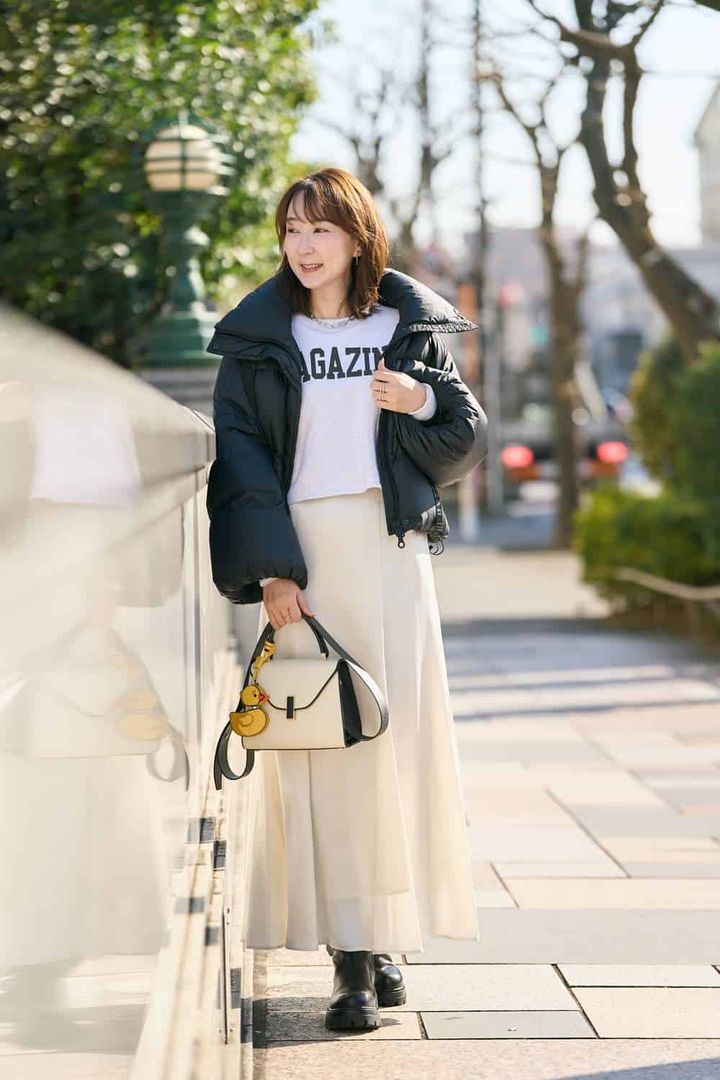 上品な光沢が気に入っているシルクのようなネオシャイニーナイロン素材のダウン。カジュアル過ぎずリュクスな印象になるので大人っぽく着られます。動くたびに艶やかに揺れる白サテンのスカートを合わせて、ダウンを着るときもフェミニンな雰囲気にまとめるのが好みです。あひるのチャームはバッグと同じValextraのもの。バッグ本体よりも圧倒的によく褒められるのでいい投資だったと思います(笑)
