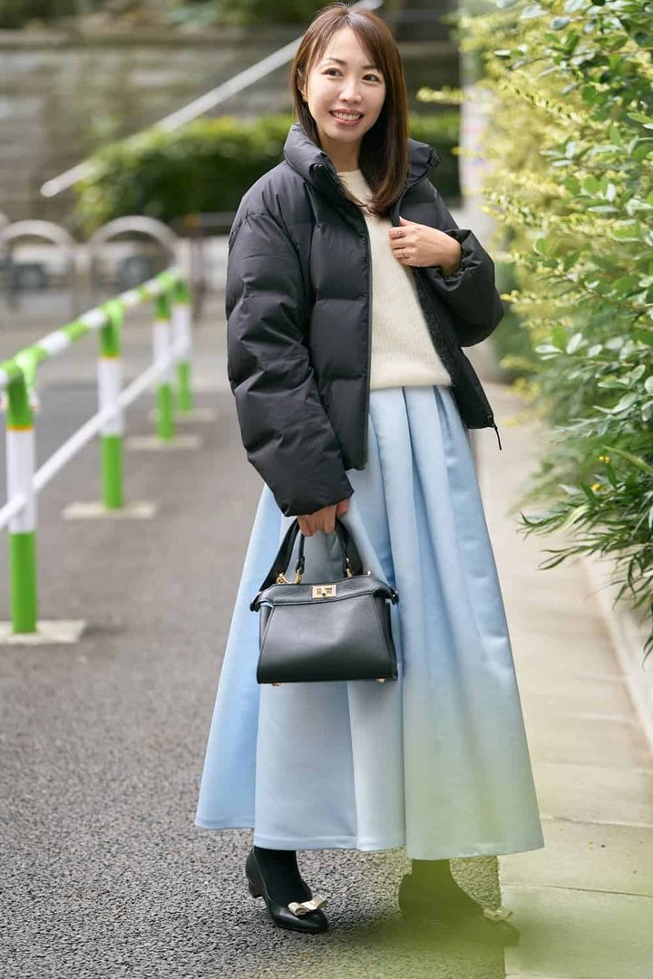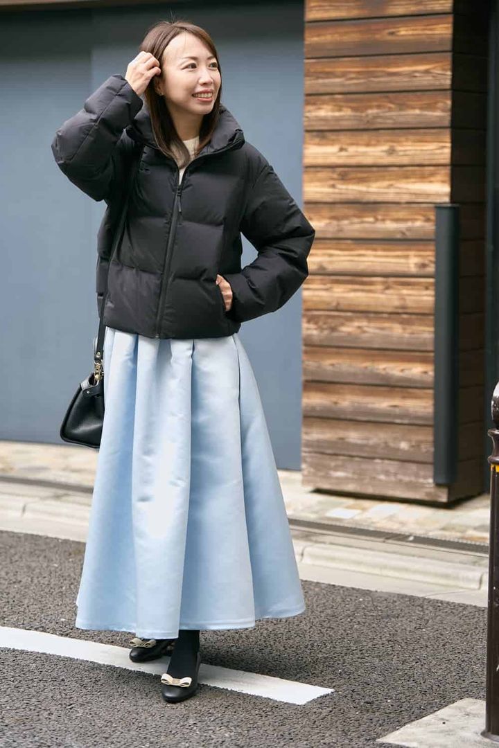 普段ロングスカートに合わせることが多いので、バランス良く見えるようにショート丈のダウンを選びました。カジュアルシーンだけじゃなく、キレイめにも使えるのでこの冬大活躍しています。黒の面積が多いと重くなり過ぎる気がするので、白ニットとカラースカートで軽やかに。お気に入りのTSURUの水色スカートは、上品な光沢で冬のダークな街で着映える1枚です。