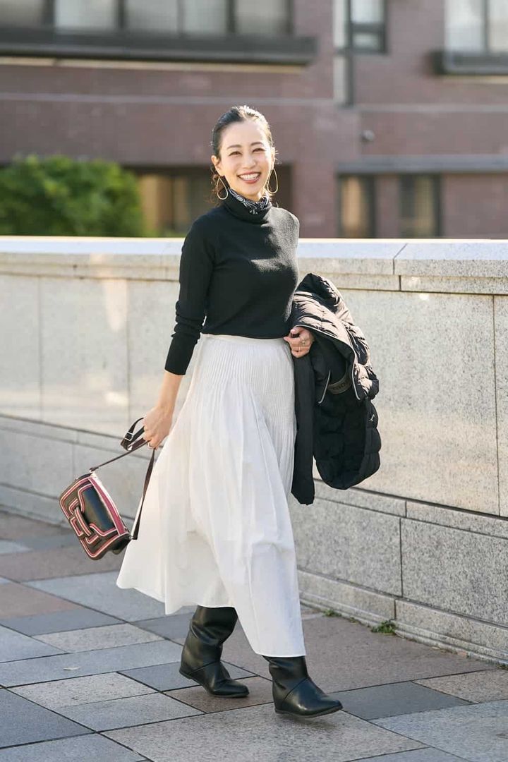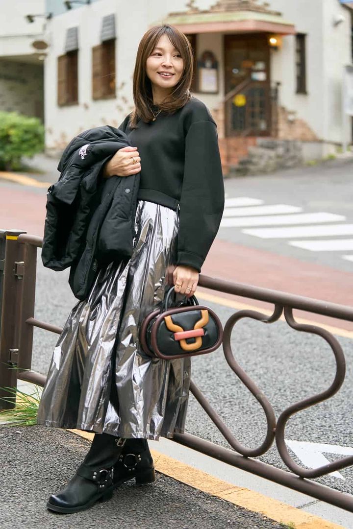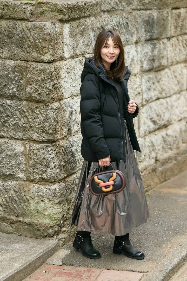 3. 40代の【今どきスカート】で冬をもう一度盛る!「黒ダウンコーデ」にも効く〈4選〉