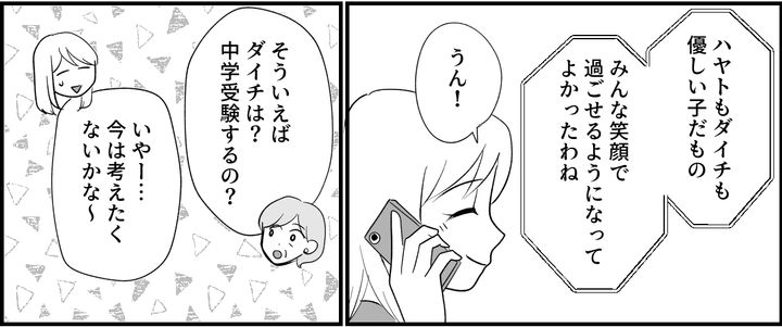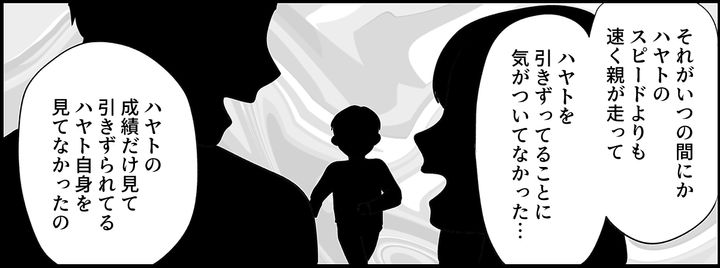 私(アイ)は夫のマサヒロと、2人の息子ハヤトとダイチの4人家族です。私たちはハヤトが希望するA中学に入れるように、家族総出で必死のサポートを始めたのでした。しかし私たちの気持ちをよそに、ハヤトは裏切り続けます。警察沙汰になったり、夫の財布からお金を盗んだり。ハヤトはどんどん私たちの知らないハヤトになっていってしまったのでした。けれどそれは、ハヤトに過剰な「期待」をかけ続けた私たちのせいでした。二学期に入ったとき。以前通っていた塾から、プログラミング受験のあるB中学を紹介され、ハヤト自身が「この学校に行きたい」と言うようになり、本気で勉強に取り組むようになりました。誰かにやらされている勉強ではなく、自分のために取り組む勉強に、私たちがしてあげられることはほとんどありませんでした。無事に合格を掴んだハヤト。彼の頑張りに、私は栄誉を称えたいと思います。