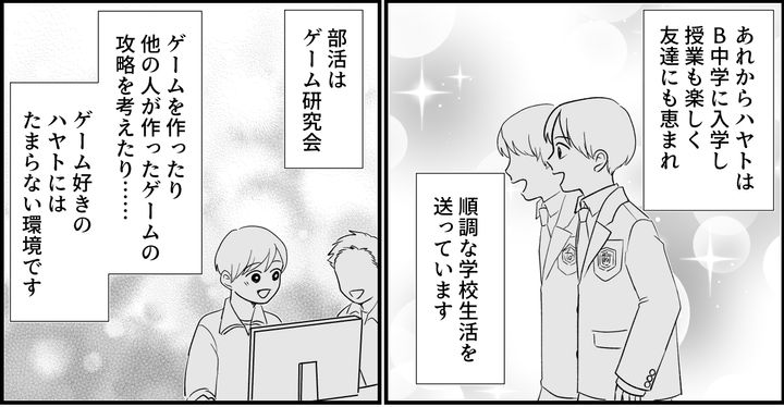 あれからハヤトは、順調な学校生活を送っています。日々の授業も楽しく、友達にも恵まれました。部活はゲーム研究会なるものに入り、ゲームを作ったり、他の人が作ったゲームの攻略を考えたり。ゲーム好きのハヤトにはたまらない環境です。
