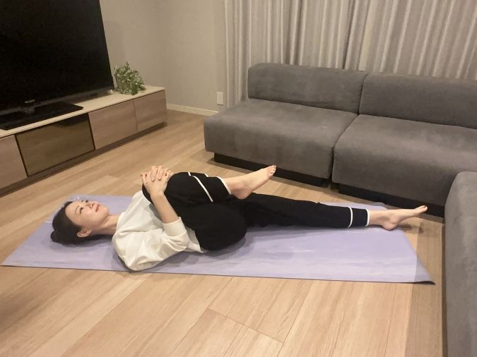 ゆったりと3〜5呼吸。脚は無理に引き寄せず、呼吸が楽にできる位置で行なってください。