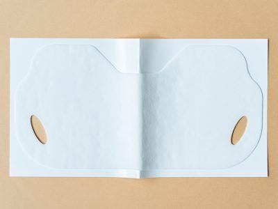 そして「マスク1」をつけてから、ゲルマスクの「マスク2」をつけると、マスクの密着度がUP! 物理的にたるんだ頬を引き上げつつ、「マスク1」に配合された美容成分をギュギュッと角質層まで浸透させてくれます。そしてペロンとなりがちな顎裏のシートマスクも密着。「マスク2」は、メントールの香りがしない湿布のような素材です。