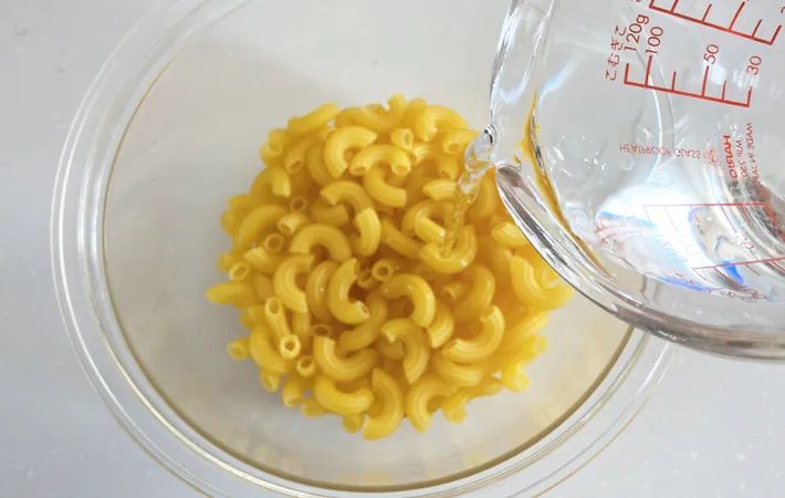 耐熱ボウルに、マカロニと水を入れます。