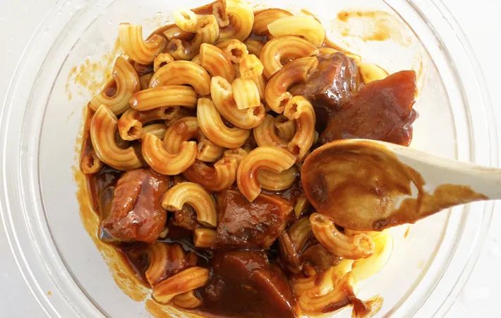 マカロニと『金のビーフシチュー』をよく混ぜ合わせ、塩、コショウで味を整えます。