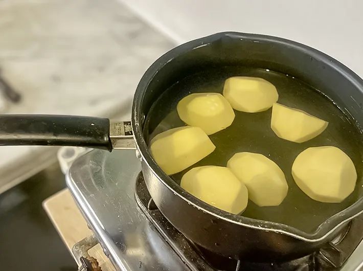 ジャガイモがかぶるくらいのたっぷりの水を使い、必ず水からゆで始めます