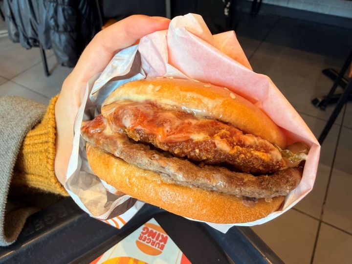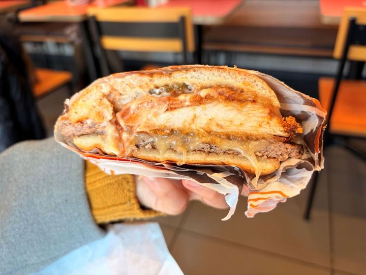 こちらはホワイトチーズソースとマヨソースが入っているので、クリーミーな味付けに。チキンパティのカリカリ食感とビーフパティのジューシーさを引き立ててくれます。