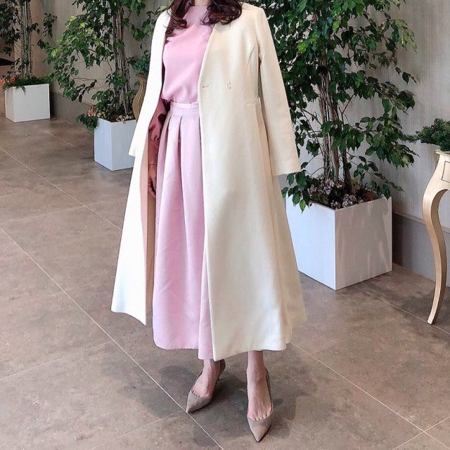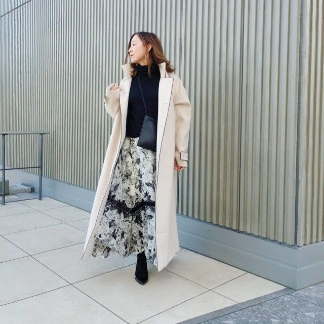 このときロング丈コートを着る場合はアイボリーやオフホワイトがおすすめ。大人にとって真っ白のコートは気恥ずかしさを感じるものですが、アイボリー・オフホワイトなら着やすいうえに羽織るだけでよそ行きコーデに決まります。