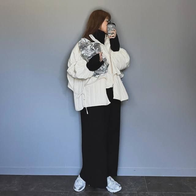 ボリュームのある白ダウンにハマるのが黒い服。ブラックカラーのパンツ・スカートやトップスを合わせるだけで、もこもこしたアウターが引き締まり着膨れ感がなくなります。さらに白黒の強い色対比からメリハリが生まれ、難しそうな白ダウンも簡単にスッキリ着こなせますよ。