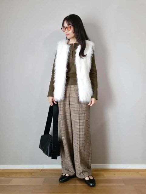 白ベストは下に着た服が見えるよう前を開けて着るのがコツ。加えてトップスとボトムをワンカラーか同系色で揃えましょう。インナーの上下が繋がり、コーデの統一感がグンとアップ。トップスとボトムの色味に濃淡をつけると、よりオシャレですよ。