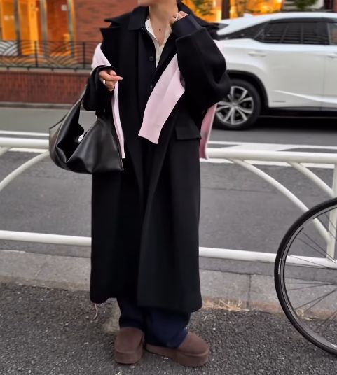 ユニクロ「スムースコットンクルーネックセーター」3,990円(サイズM着用)を差し色として肩掛けし、顔周りを明るく見せているのがポイントです。重厚感のあるロングコートの上からピンクのニットを肩掛けすることで、視線を上に集めてスタイルアップを叶えつつ、遊び心のある配色を楽しめます。足元には厚底のムートンシューズを合わせ、程よいボリューム感で今っぽくまとめています。