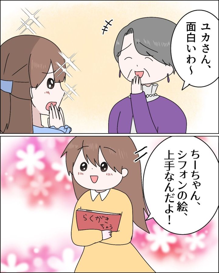 そんな私を見て「ユカさん、面白いわ~」と笑ってくれた義母。好きすぎて引かれるかなと心配していた私は、ポジティブに受け止めてくれる義母にも感動。すると、そこへマナが「ちーちゃん、シフォンの絵、上手なんだよ!」と嬉しそうに言いながら落書き帳を持ってきました。そういえば、マナはいつも知佳さんにお絵描きで遊んでもらっていたんだった!