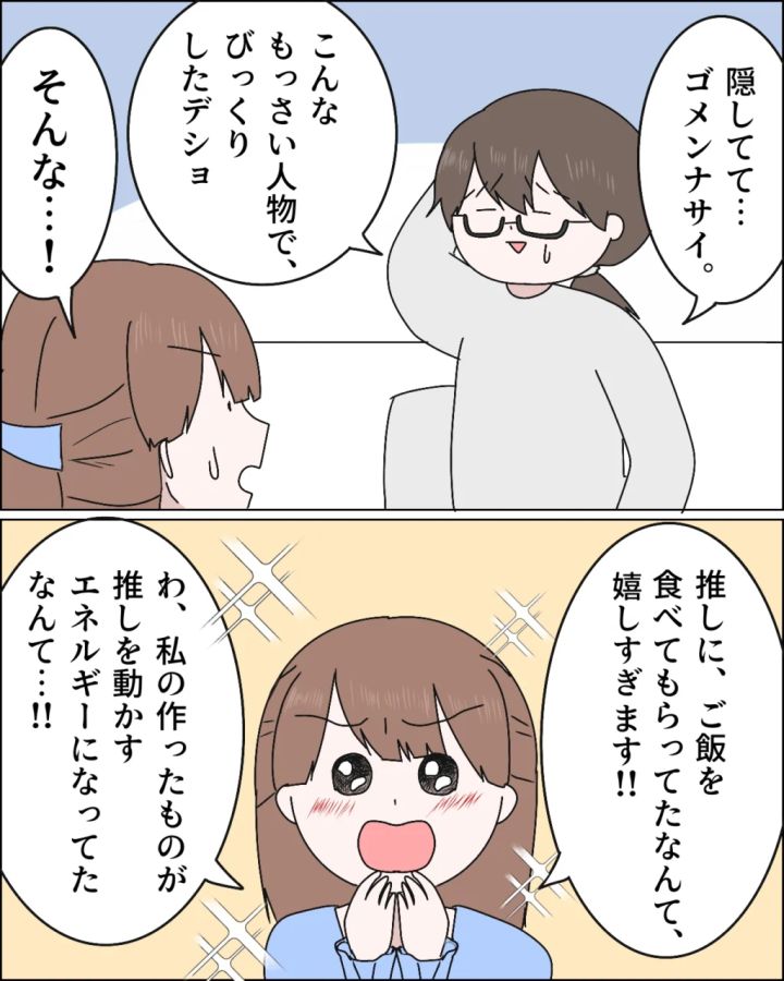 「隠してて・・ゴメンナサイ。こんなもっさい人物で、びっくりしたデショ」と申し訳なさそうにする知佳さん。私は「そんな・・!推しにご飯を食べてもらってたなんて、嬉しすぎます!!わ、私の作ったものが推しを動かすエネルギーになってたなんて・・!!」と嬉しさが爆発。