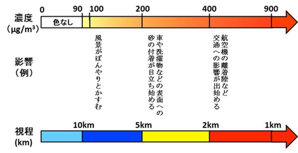 ・400μg~900μg/㎥=視程2~1km程度:航空機の離着陸など交通への影響が出る