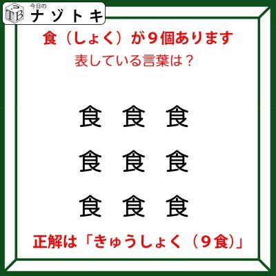 漢字は「食(しょく)でそれが全部で「9個」存在しますね。つまり、「9個」の「食(しょく)」があることになります。「9(きゅう)」の「食(しょく)」ここまでいけばわかりますね。