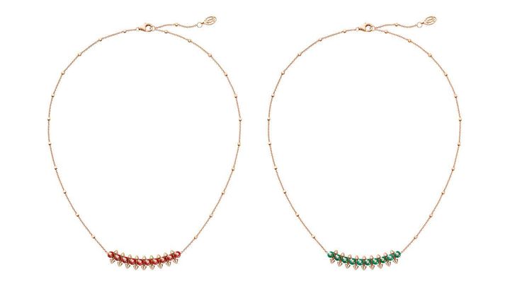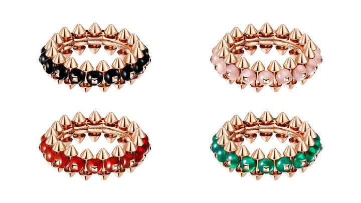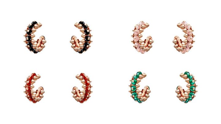 カルティエの象徴的な3つのモチーフ、ピコ、ビーズ、クル カレがひとつとなって、エッジの効いた⼒強く独創的なメッシュを織り成し、ジュエリーの新たなシグネチャーとなった「クラッシュ ドゥカルティエ」。新作はレッドアゲート、グリーンアゲート、ピンクカルセドニー、オニキスが彩るデザイン。ピンクゴールドのピコを挟み込むように配されたハードストーンのビーズが、リング、ペンダント、イヤリングの⽴体的なボリュームを際⽴たせています。