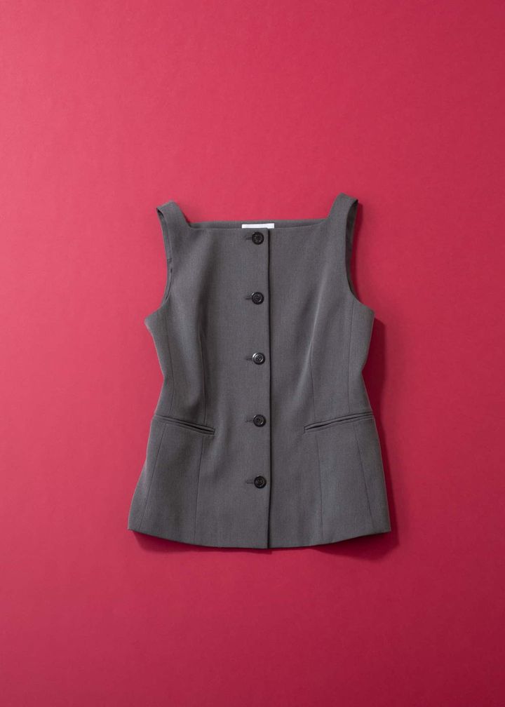1枚プラスするだけで〝きちんと見え〟が即叶う、忙しい大人の味方ジレ。気になる体型をさりげなくカバーできて、冷房対策にも便利なのが嬉しいポイントです。今季らしく取り入れるなら、顔まわりがスッキリ見える浅めのスクエアネックが正解。インナーを選ばず夏手前まで着回せて、シャープなポケットラインが全身を引き締めてくれます。さらにマシーンウォッシャブルで、オフィスでもデイリーでも頼れる1枚に。