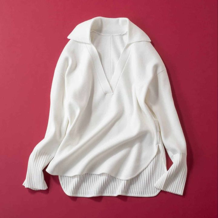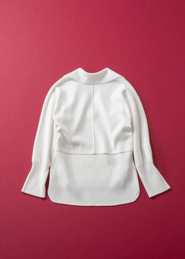 清潔感を纏えるクリーンなホワイトのスキッパーニットは、働くSTORY世代の頼れる一枚。深めのVネックで顔まわりをスッキリ見せつつ、襟付きデザインできちんと感もキープできます。体のラインを拾いすぎないサイズ感と、背中のプリーツ切り替えが程よい抜け感をプラスし、堅すぎないのにきちんと見える“ちょうどいい距離感”が叶います。