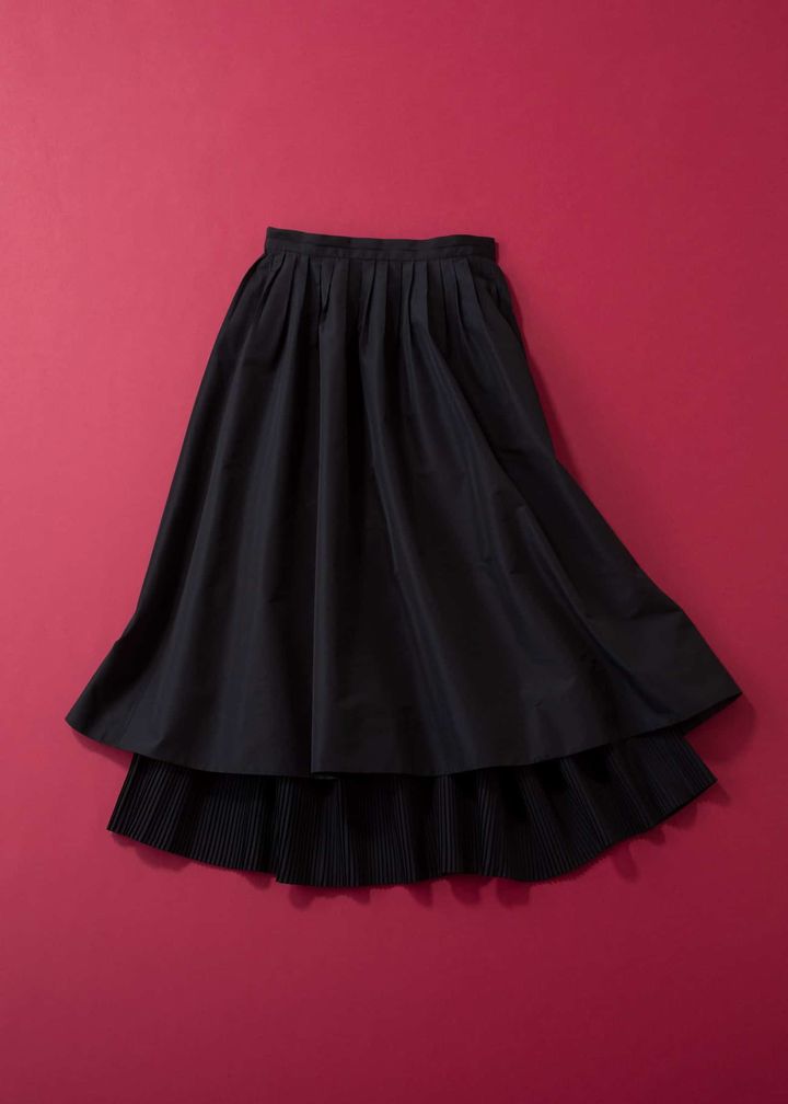 かしこまりすぎずに華やげる、コットンシルクを贅沢に使ったドラマチックスカート。ほんのり上品なツヤ感が、着るだけで高揚感をプラスしてくれます。プリーツ生地をレイヤードした立体的なデザインが動くたびに美しく、ブラックでも重く見えず派手すぎない着映えを約束。Tシャツ合わせでカジュアルダウンも、ニットやブラウスでキレイめも自在に楽しめて、仕事の大切な日から“ここぞ”の予定まで頼れる1枚です。