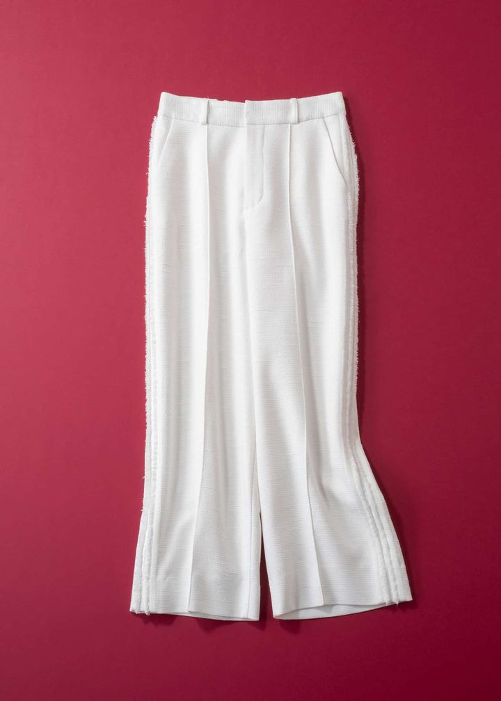 春の装いを一歩先に進めてくれるのが、ツイード素材のラインパンツ。ラメ糸を織り込んだ凹凸のある表情が華やかさを添えつつ、派手すぎず大人にちょうどいい品の良さをキープします。サイドラインはフリンジ×サテンの異素材仕上げで、スポーティでもラフ見えしないのがポイント。シンプルなトップスを合わせるだけで、高感度な大人モードが完成します。さらにマシーンウォッシャブル対応で、クリーンな白も気負わず楽しめる、オン・オフ頼れる1本です。