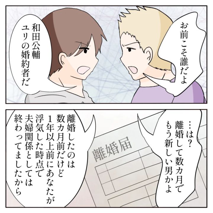 「お前こそ誰だよ」と食って掛かってくる元夫に俺が「和田公輔。ユリの婚約者だ」と答えると、「・・は?離婚して数ヶ月でもう新しい男かよ」とユリを軽蔑するように言い捨てた元夫。俺は「離婚したのは数ヶ月前だけど、1年以上前にあなたが浮気した時点で夫婦関係としては終わってましたから」ときっぱり反論しました。