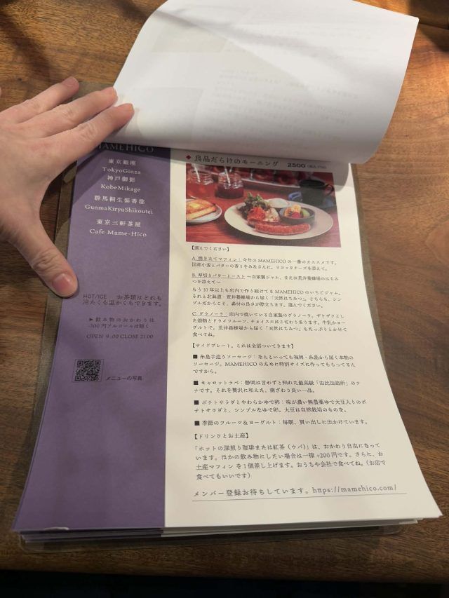 「良品だらけのモーニング」「日常が良質」「ミニマム生活」の3つが用意されています。 どのメニューも、焼きたてマフィン、厚切りバタートースト、グラノーラからメインを1つを選びます。 さらに、ドリンクは珈琲か紅茶(ウバ)が選べて、おかわりも可能。
