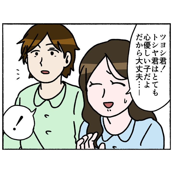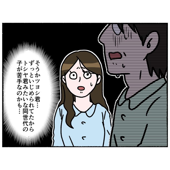 ツヨシ君と歳が近いトシヤ君は、共通の趣味があってうれしくなり、グイグイと話しに行った。しかし長年いじめに遭っていたツヨシ君は恐怖が蘇り、腰が引けてしまう。