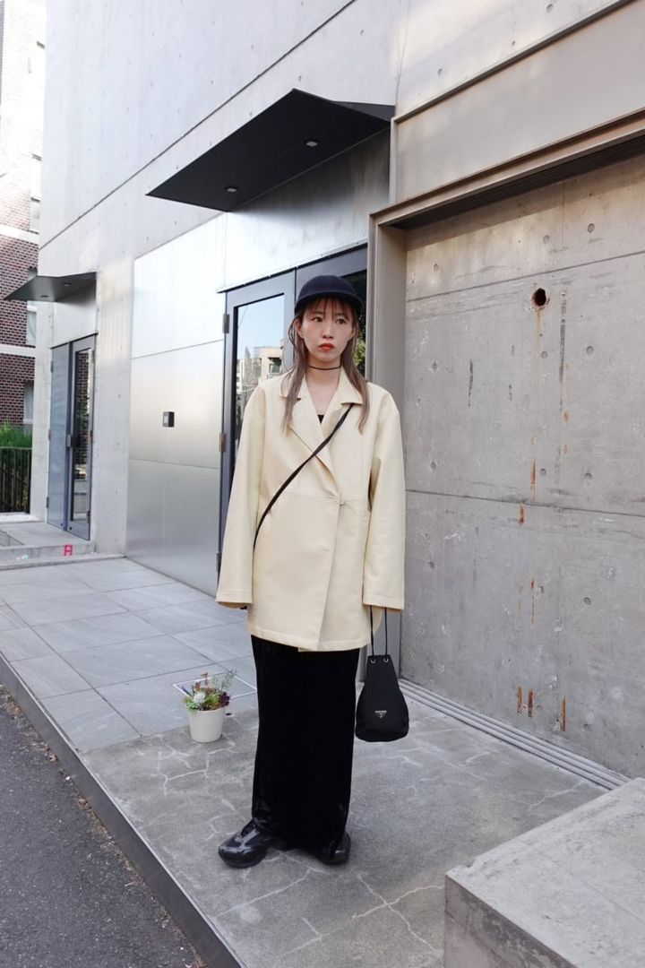 【30代スナップ】CA4LAのキャップで目線アップ! 白のコートで作る大人のモノトーンコーデ