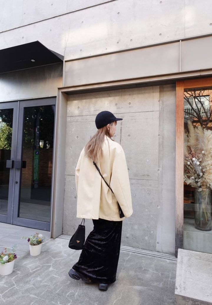「saharaのオーバージャケットは、フェイクレザーだから軽量で着心地も抜群! 直線的なフォルムなのでコーデを選ばず使え、重宝しています。ボトムはとろみ感のあるベロアスカートをセレクト。Iラインを強調できるシルエットだから、すっきりとまとまります。小物でも黒を投入して、スタイリッシュに仕上げました」(MARTE/saharaブランドマネージャー、SYKIA デザイナー三好香織さん)