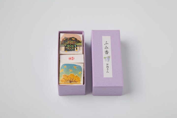 安土桃山時代の創業から、一貫して香りと向き合ってきた「薫玉堂」。その美意識が凝縮された“ふみ香 お西さん”には、西本願寺の紋である下り藤をイメージする藤の絵柄があしらわれ、中には名所を描いた美しい香が収められている。白檀をベースとした上品な薫りは、手紙を受け取る相手への贈り物としてはもちろん、財布や本に挟んで自分だけの香りを愛でるなど、用途は幅広い。