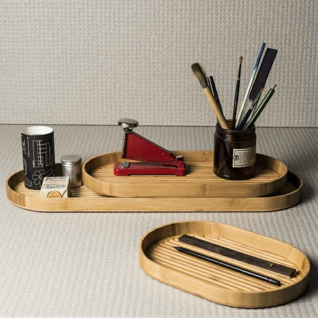1898年の創業以来、竹の新たな価値を追求し続ける「公長斎小菅」が手がけるオーバル型のトレイは、日本の風景を映したかのような落ち着いた印象を与える。竹の集成材を用いることで一点ごとに異なる節や模様が浮かび上がる、自然素材ならではの豊かな表情を楽しみつつ、スタッキング可能な機能美によって、散らかりがちなデスク周りの小物もスマートに収め、空間を端正に整えてくれる。