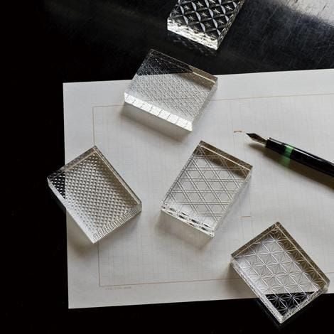 1899年創業、東京で最も歴史ある硝子メーカーの一つ「廣田硝子」。透明度の高い光学ガラスに伝統の江戸切子を施した“切子模様文鎮”は、会津塗の技術を掛け合わせることで、通常の切子とは一線を画すミラーのような光の屈折を実現している。魚子や菊繋ぎなど、古くから愛される5つの紋様は、どんな景色にも馴染みながら書斎に知的なアクセントを添えてくれる。桐箱に収められているので、贈り物としてもおすすめ。