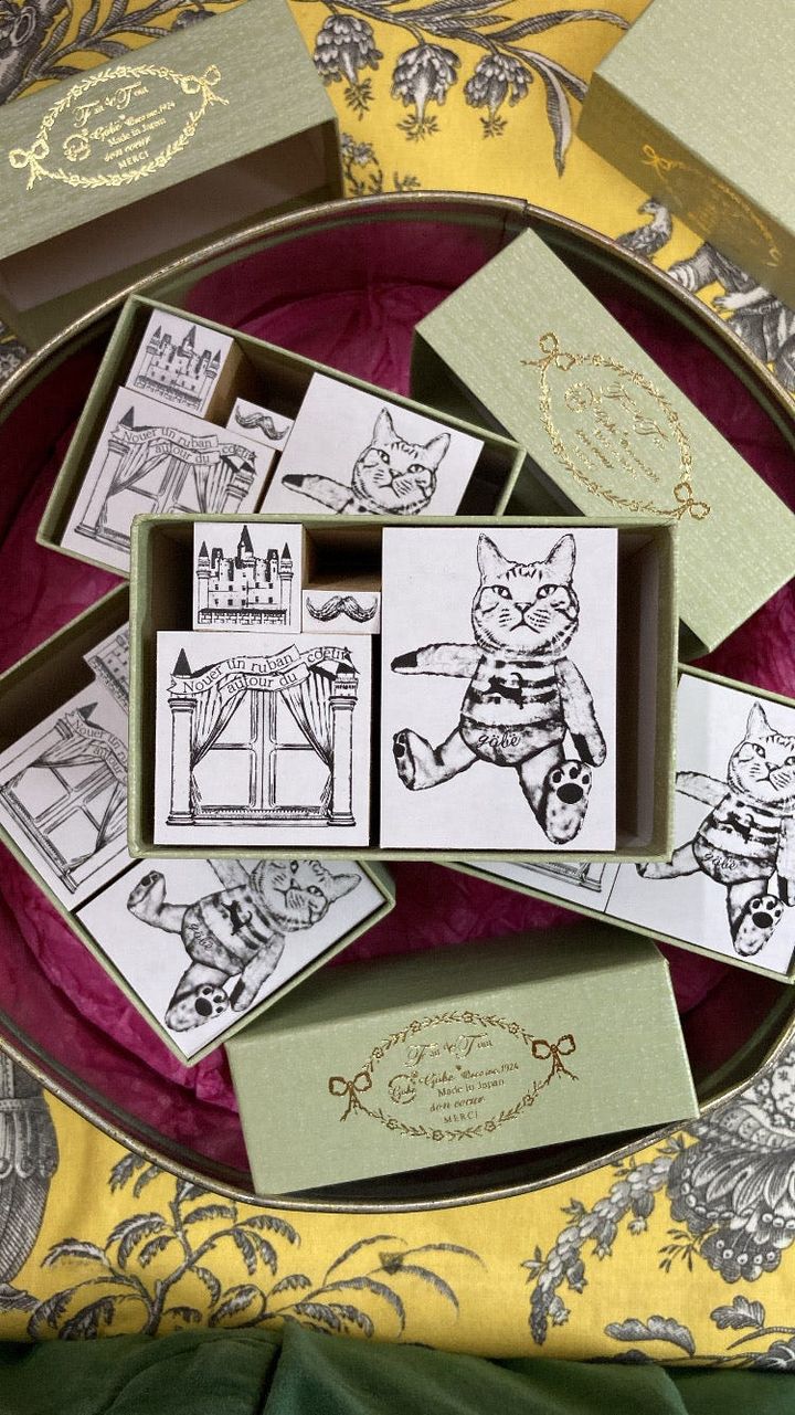 大正13年創業の印鑑店を引き継ぐ3代目が、女性ならではの感性で提案する「göbëstamp」。伝統の製法で一点ずつ手作りされるスタンプは、国産ならではの繊細な陰影が美しい。写真の「シマちゃんセット」は、しま猫や積み木のお城など、遊び心溢れる4種を収めたもの。多彩なラインアップの中からお気に入りを選び、自由に組み合わせることで、身の回りの小物が自分だけの特別な一品へと変わる愉しみを味わいたい。