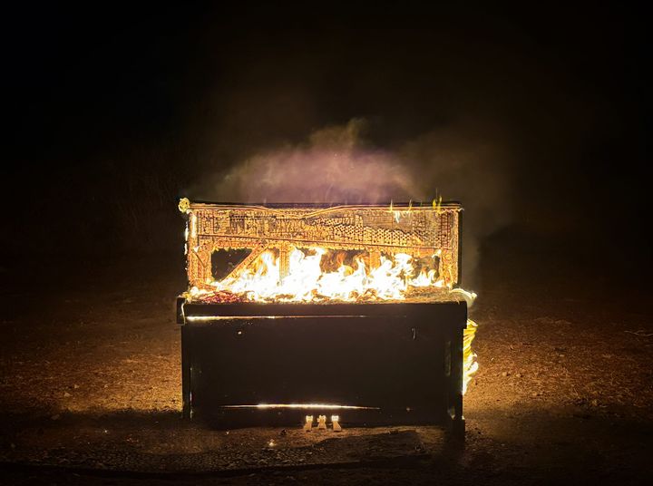 館内の6つのギャラリーを地下劇場に見立てた回廊型インスタレーションで、東日本大震災で破壊されたグランドピアノ、血で染めたドレスや靴、燃えるピアノのインスタレーションなど、新旧のアートワークを再構築。ジェンダーの不平等、激甚化する自然災害、終わりなき侵略といった現実世界の問題を、展覧会タイトルにあるとおり「火」という根源的なメディアによって照らし出していきます。