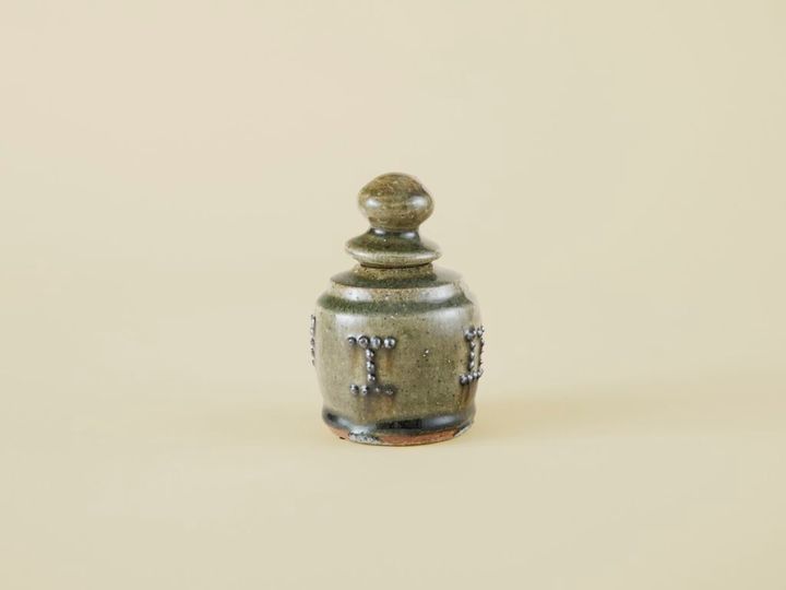 以前にも紹介した〈倉敷青木窯〉による、陶器製の栓付瓶。おそらくヨーロッパの瓶から影響を受けた形なのではないかと思います。それが陶器となることで、ガラスや磁器とは違う少し歪な形状となり、見ていても飽きない一品となるのです。ドット状の"いっちん"によってⅠ、Ⅱ、Ⅲ、Ⅳというローマ数字が施され、独特な雰囲気を出しています。密封はできないものの、使い手の自由な発想によって用途が広がるのも楽しいですね。