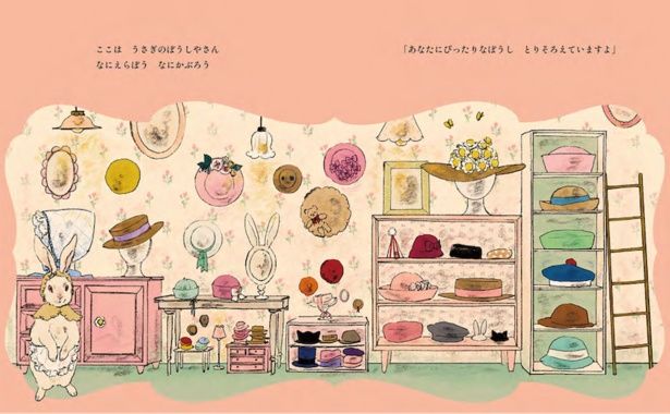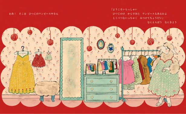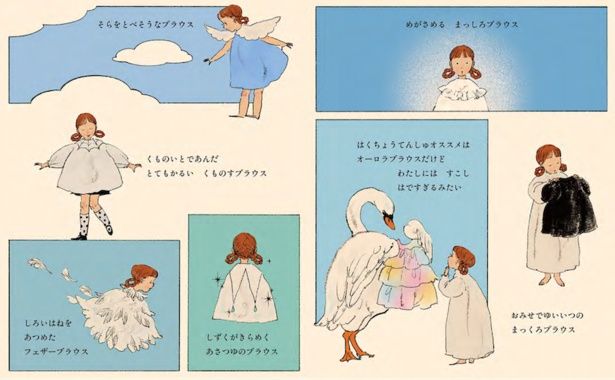 羊のワンピース屋さん、白鳥のブラウス屋さん、うさぎの帽子屋さんなど、お店ごとにわくわくするようなファッションアイテムが並ぶ。モコモコひつじぐもワンピース、オーロラブラウス、きたかぜがきこえるみみあて……。「なにえらぼう なにきよう」と女の子は、心ときめく洋服選びの旅に出る。想像力を刺激するお洋服や小物の数々に、娘もすっかり夢中な様子。