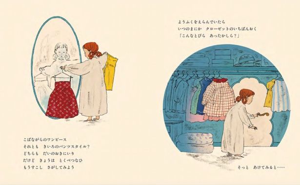 もっとも、この絵本の魅力は、読み聞かせの場面だけにとどまらない。ページをめくるたびに現れる洋服や小物の数々は、子ども以上に大人の想像力をくすぐる。色や質感、名前のひとつひとつに物語が宿っていて、じっくり眺めていると、時間を忘れてしまうほどだ。実際、この書評を書きながら絵本を読み返しているときに、何度手が止まって見入ってしまったことか!
