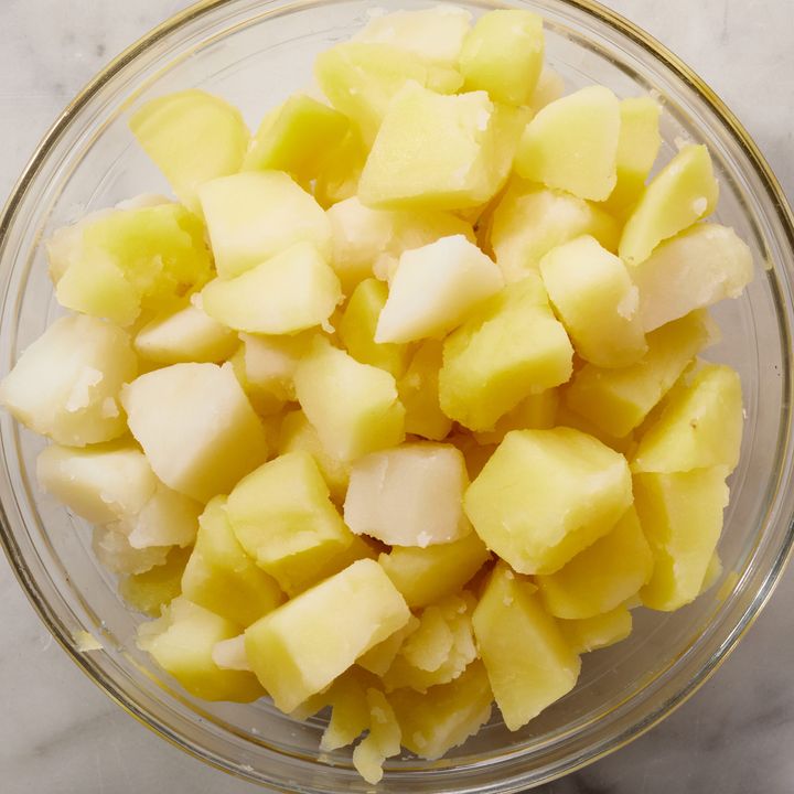 実際、丸ごとのじゃがいもを完全に茹で上がるまで1時間以上も茹でる余裕なんて誰にもない。それに、複数の品種を混ぜて使う場合、それぞれの品種で調理時間が異なる。つまり、もっとも早く均一に火を通すには、じゃがいもを水に入れる前に均等な大きさの角切りにするのがおすすめ。じゃがいもの下ごしらえに費やした時間を含めても、全体の工程がずっと短くなり、時間を節約できる。