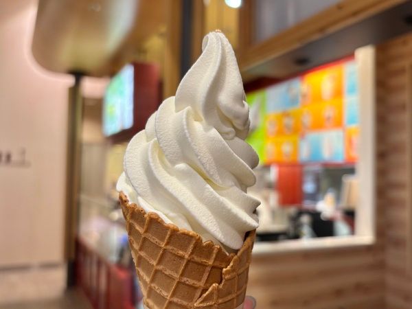 ワッフルコーンに美しく盛り付けられたソフトクリーム。一口頬張ると、爽やかで生乳感溢れるミルクの甘さ&滑らかでコクのある味わいにうっとりします。