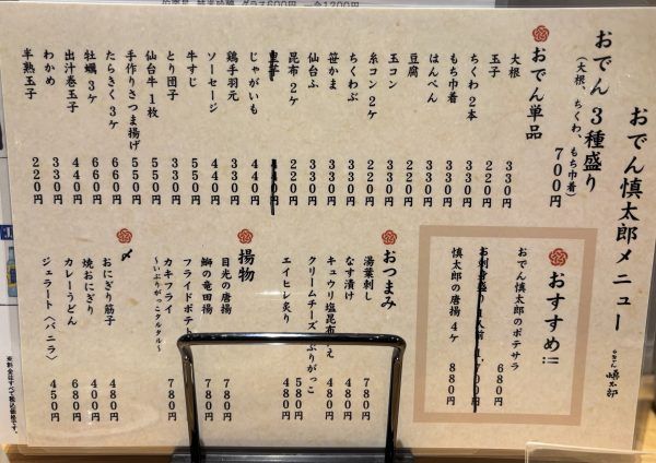 おでん慎太郎 宮城県仙台市青葉区上杉1-7-7 1階 電話 022-399-9089 営業時間 月~木 17:30~22:30(料理L.O.21:30 ドリンクL.O.22:00) 金・土: 17:30~23:30(料理L.O.22:30 ドリンクL.O.23:00) 祝日:17:30~23:00(料理L.O.22:00 ドリンクL.O.22:00) 定休日:日曜 ※定休日は変更になる場合もあり。お店へ確認を。 https://oden-shintaro.owst.jp/