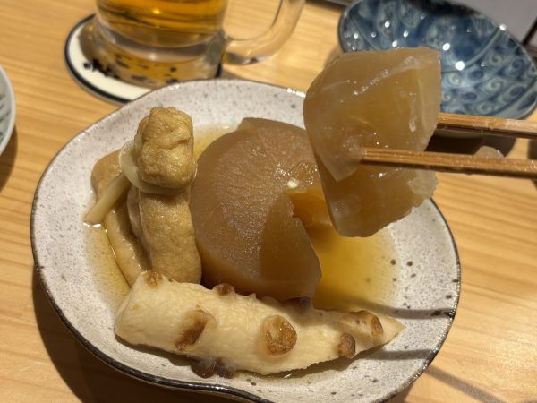 大根に、鰹節と昆布のお出汁がシミシミで、お口の中が美味しいと言ってます。子どもの頃は、おでんの出汁になるもの、鶏の手羽元や鯨のコロが好きでしたが、年齢を重ねて出汁の染みた大根の美味しさがわかるようになりました(笑)