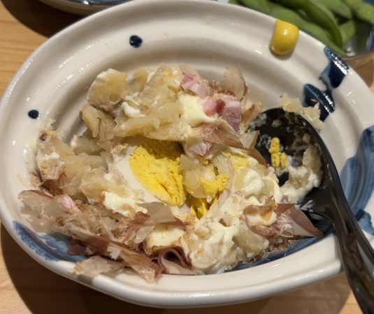「ポテサラ」は、ジャガイモとタマゴのおでん、厚切りベーコンに、鰹節とマヨネーズをお皿で混ぜ混ぜ。楽しい。自分の好きな大きさに潰していただきます。ジャガイモは、出汁が効いていてマヨネーズとのコラボが美味しい。鰹節がアクセントになってる。鰹節好きやなー。
